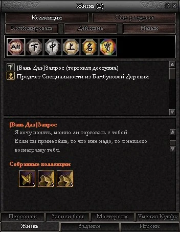 Фактически сбор коллекции делится на два этапа - сбор (нужно найти или получить требуемые предметы) и обмен на награду. Разберем подробнее эти этапы на примере коллекции под названием “[Вань Даэ] Запрос”.