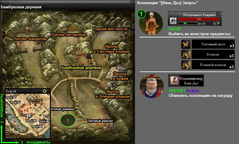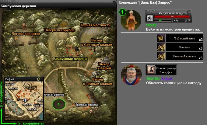 [Примечание] Предметы для коллекции можно выбивать из различных видов "Бандиток": Испуганная бандитка, Слабая бандитка, Жестокая бандитка, Самоуверенная бандитка и т.д. Если вдруг, уровень персонажа сильно превосходит уровень данных мобов, требуемые предметы можно выбить из Бандитов, которе находятся в Лагере лесорубов и Лагере бандитов (врехняя часть локации Бамбуковая деревня).