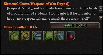 The collection requirements for an Elemental Crown Wan Daye Weapon