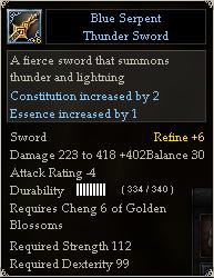 These weapons are obtained as rare drops from mobs, from quests, or from the Wan Daye collection. They provide attribute changes, as well as changes to VE, HP, critical rates, movement speed, etc. As a rule, these weapons are more expensive, especially at higher levels of refinement (as they are more prone to breaking during the refine process.)